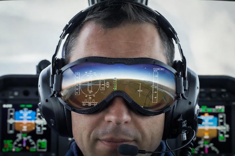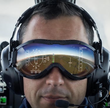 Augmented Reality HUD: A built-in transparent OLED display projects essential flight data—altitude, airspeed, navigation waypoints, weather overlays—directly onto the lens. This is powered by a compact processor (like a Snapdragon chip) embedded in the frame, with gesture or voice controls to avoid distracting pilots. Realistic tech: Based on existing AR glasses like Vuzix Blade, but hardened for aviation vibrations and G-forces.